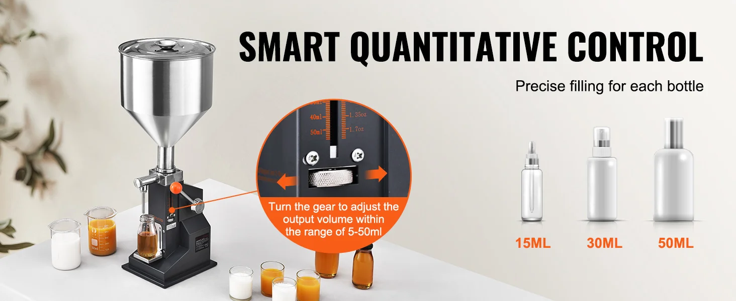 Precision Quantification: Get it just right every time! This manual liquid filling machine comes with clear, easy-to-read scale markings. Adjusting the filling quantity is a breeze – simply turn the gears. It's precise, with a range of 5-50ml (based on water). Count on consistent and accurate filling, no matter what.
