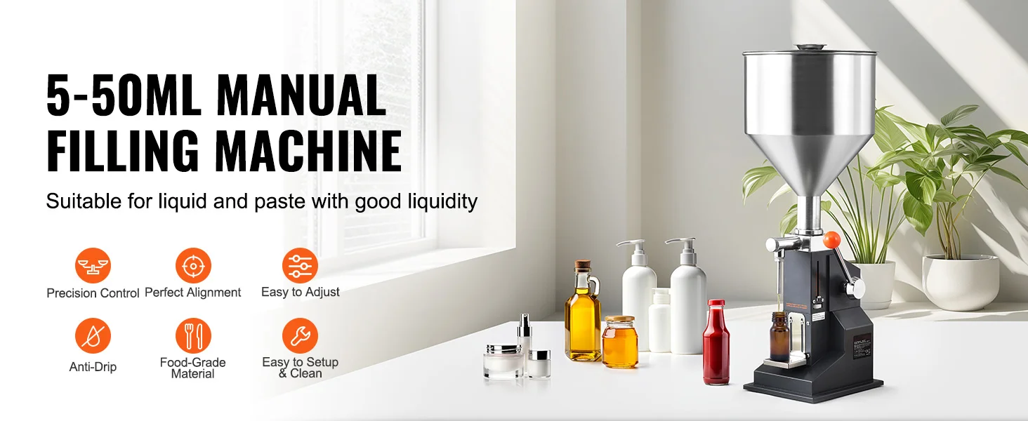 SucceBuy A03 5-50ml/5-100ml Manual Liquid Filling Machine Paste Bottle Filler Adjustable with Hopper for Water Shampoo Honey